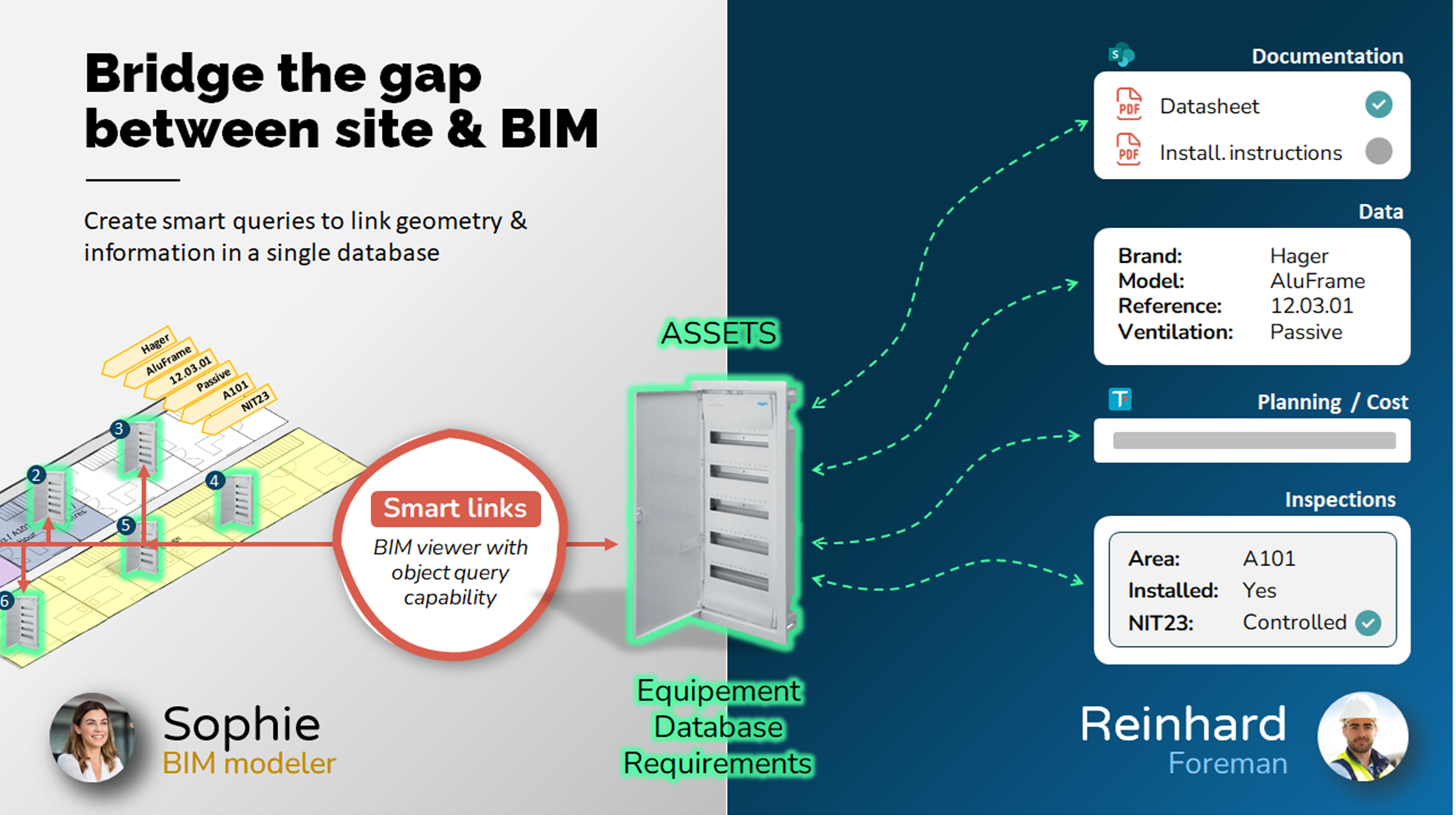 On the other side, the construction team can enrich the assets with the documentation and information they have available (product data, schedule, cost, inspection reports, etc.) without needing any BIM expertise. For them, it's simply a matter of working in the same way they would on a collaborative document management system or in an Excel table.