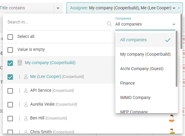 The user filter has been improved to make it easier to select predefined Me and My Company users, as well as users from a particular company.