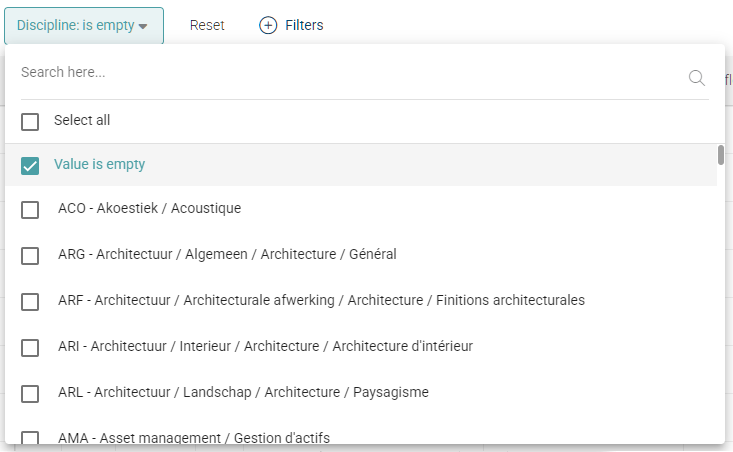 The Search filter allows you to search simultaneously in the title, code, and filename. If you wish to search explicitly on one of these system fields, they are available via the Add filters button.