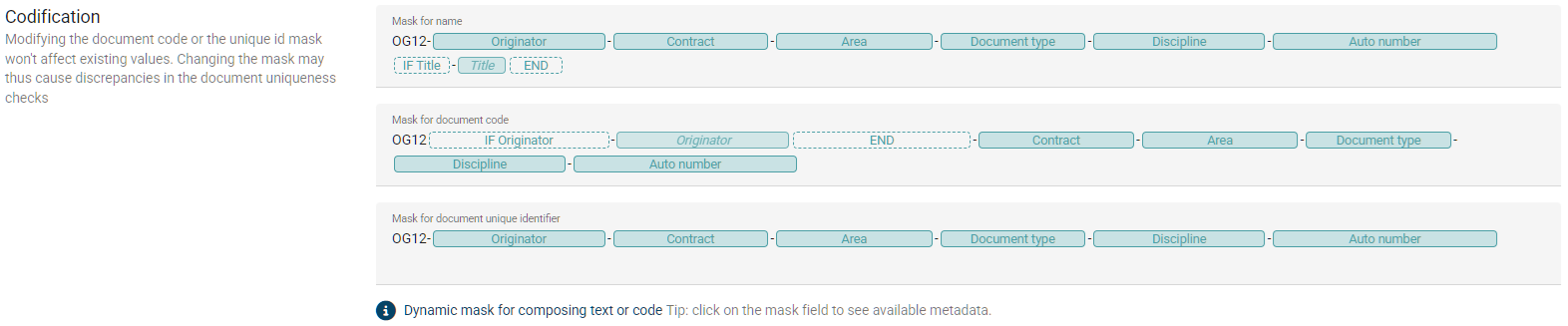 In documents settings, the visuals of the naming conventions have been improved for better visibility, especially of conditional fields.