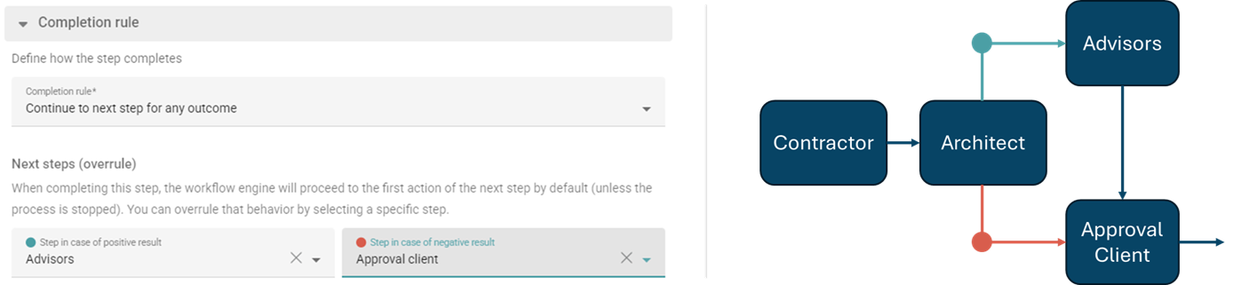 For more complex projects, the Cooperlink engine now allows the creation of multiple branches in workflows based on the outcome of each step. By default, the workflow advances to the next step. The project admin can modify this default behavior by specifying different destination steps.